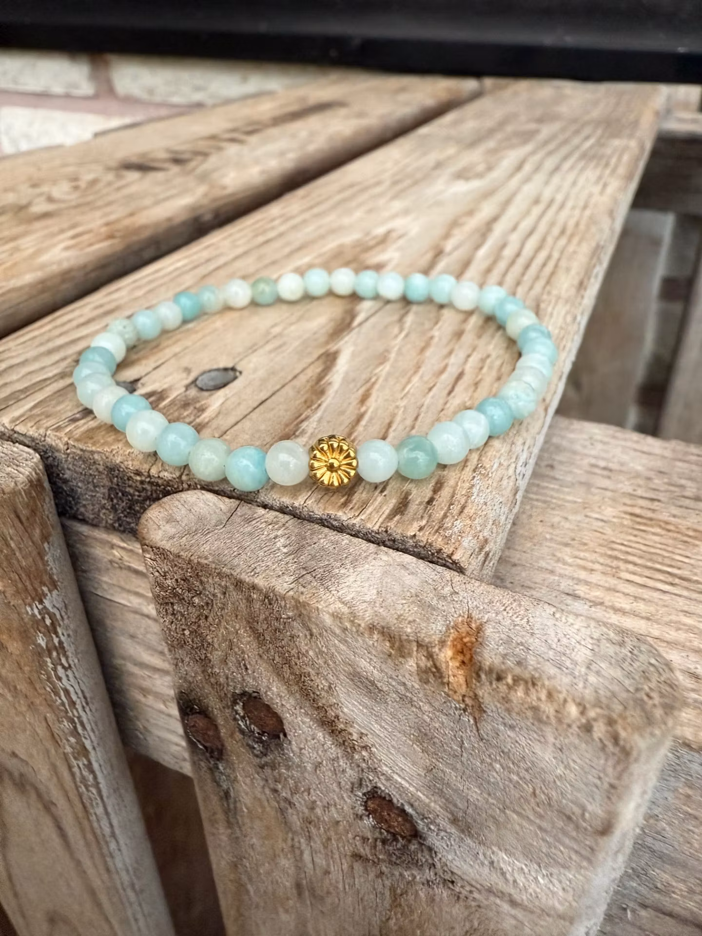Armband – Amazonit & blomma 0 kr 160 kr Armband med 3-4 mm pärlor av amazonit och en liten guldfärgad blomma.Mått: 17 cm.Alla stenar är olika och färgskiftningar förekommer.