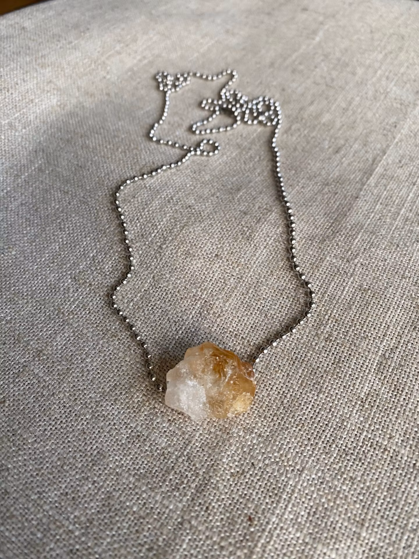 FYND – Långt halsband med rå citrin Slutsåld Halsband med en rå sten av citrin.Kulkedjan är ca 85 cm och nickelfri.Stenens mått är ca: 2 cm.Stenarna är något ojämna, därav fyndpriset.