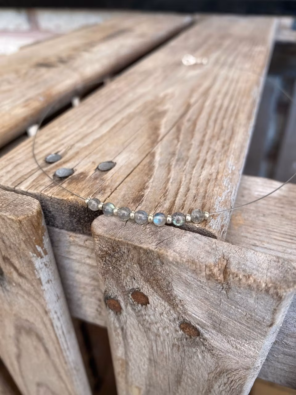 Kort wirehalsband – Labradorit 0 kr 150 kr Kort halsband med små, pärlor av labradorit och silverpärlor.Trädda på tunn vajer och med lås i silverfärgad, nickelfri metall.Mått: ca 42 cm.