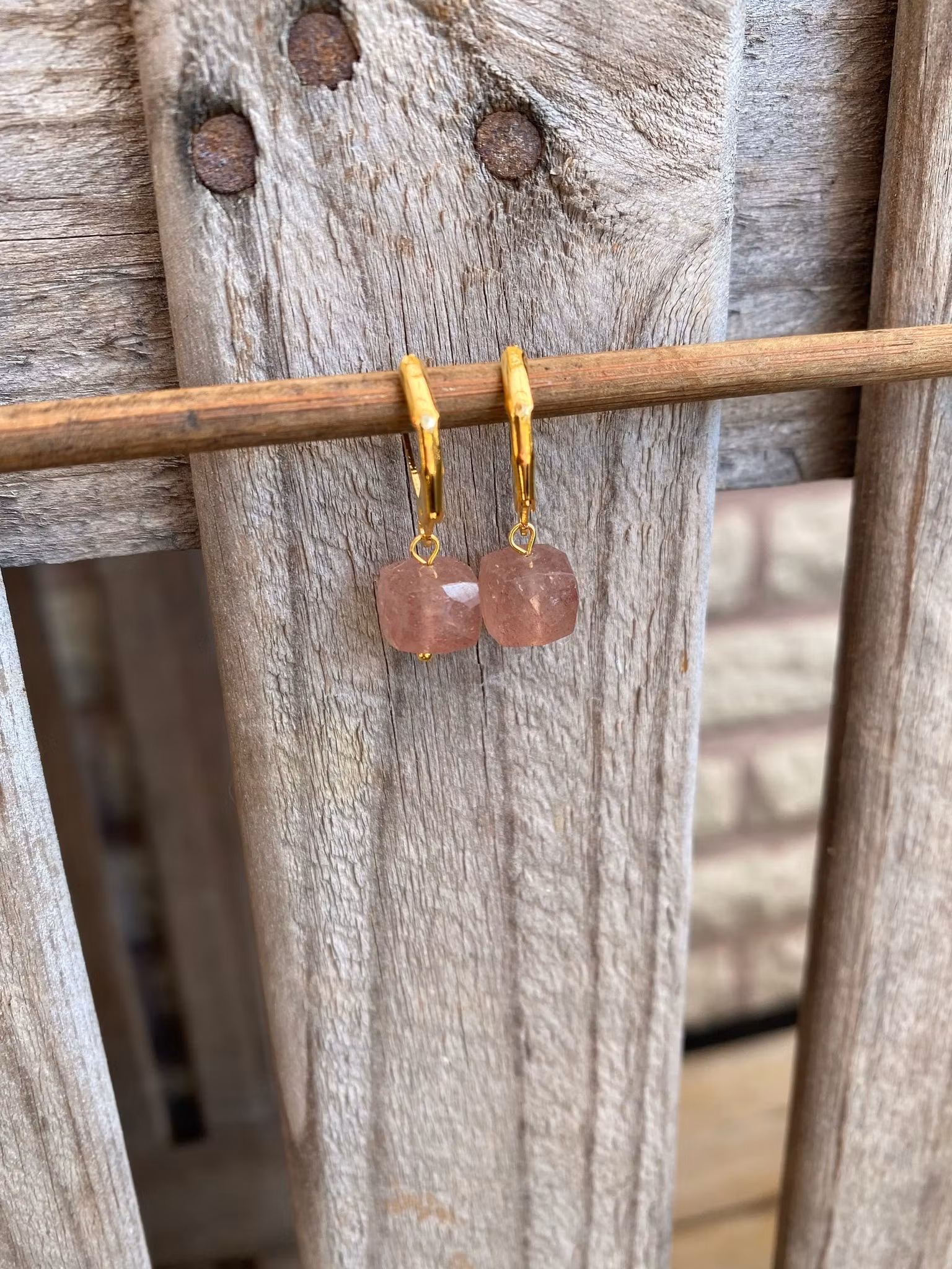 Örhängen – Jordgubbskvarts 0 kr 129 kr Örhängen med 8 mm små facetterade kuber av jordgubbskvarts.Öppningsbara öronkrokar av nickelfri, guldfärgad metall.