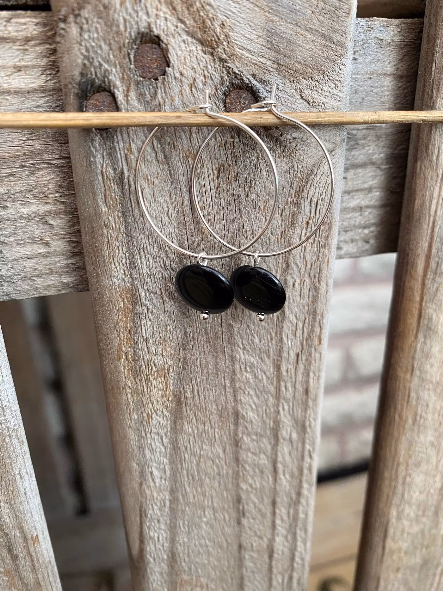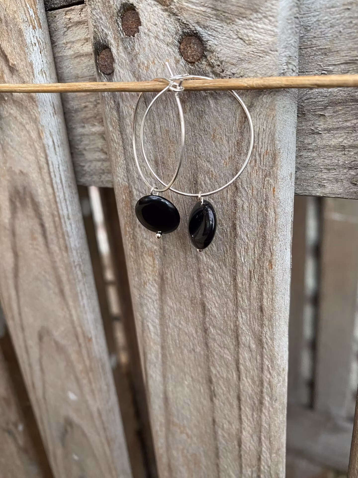 Örhängen – Svart agat 0 kr 129 kr Örhängen med 1 cm, platta pärlor av svart agat.Öppningsbara creoler av nickelfri, silverfärgad metall.Ø: 2,5 cm.