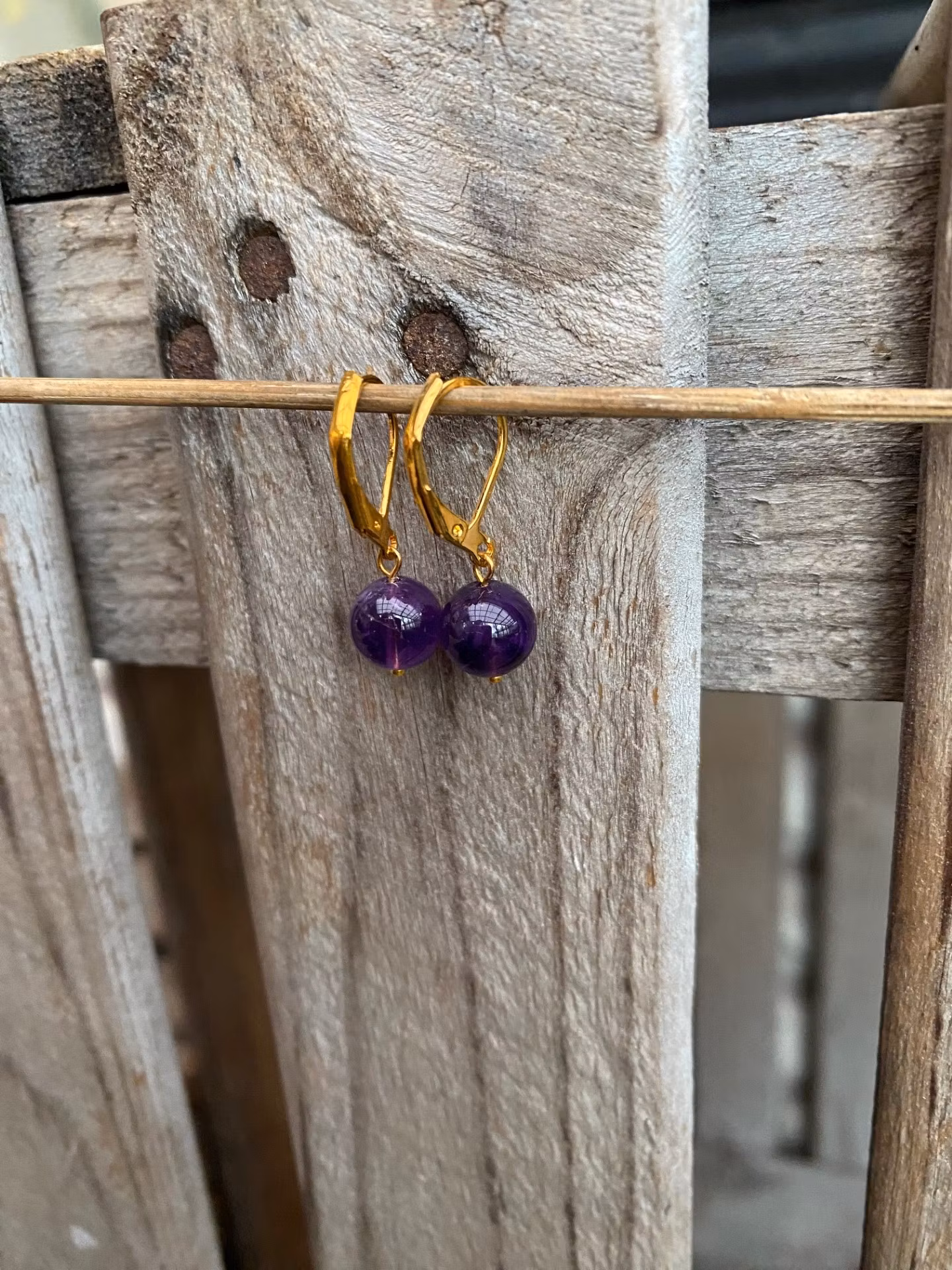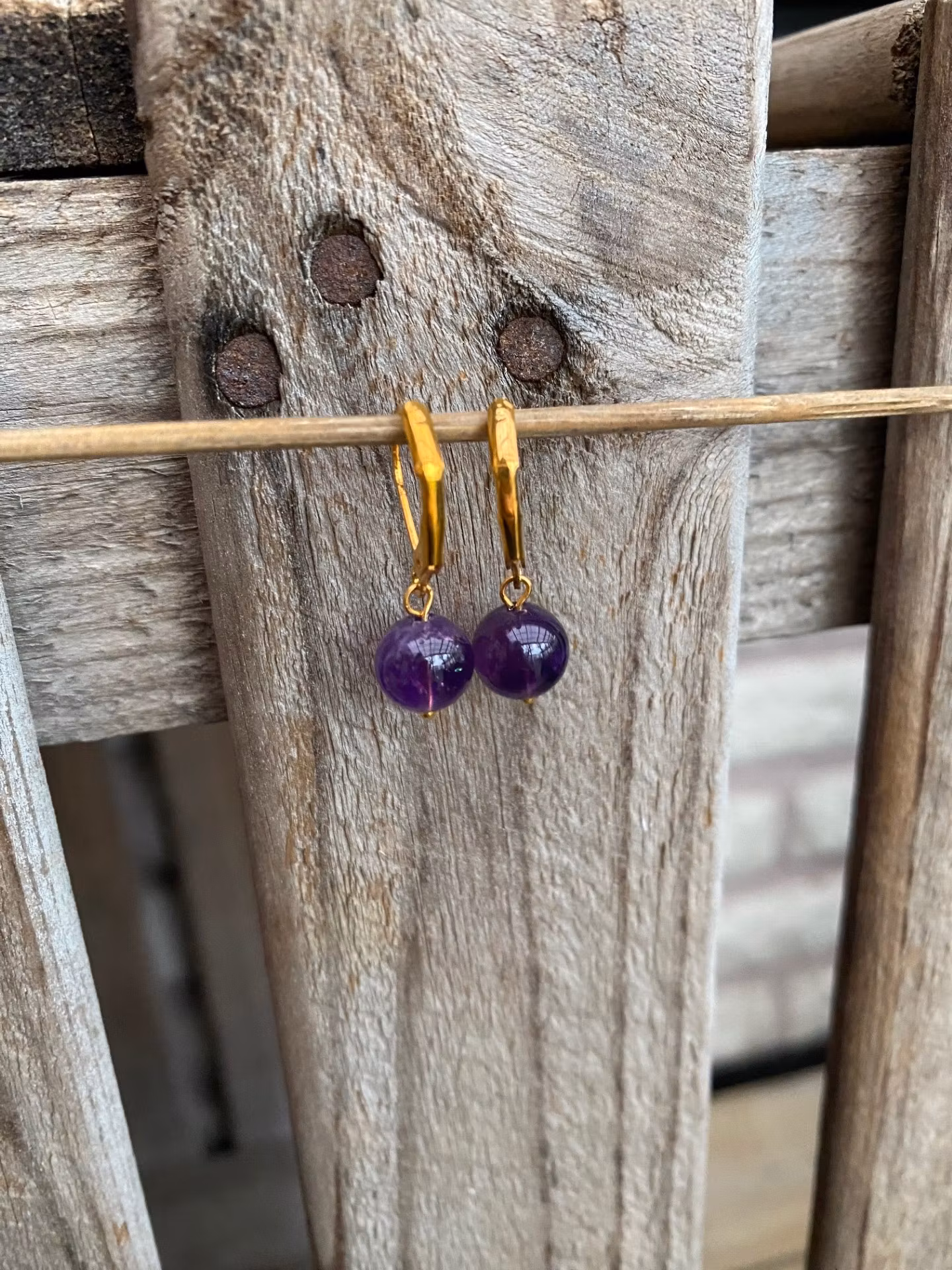 Örhängen – Ametist 0 kr 119 kr Örhängen med 8 mm pärlor av ametist.Öppningsbara öronkrokar av nickelfri, guldfärgad metall.