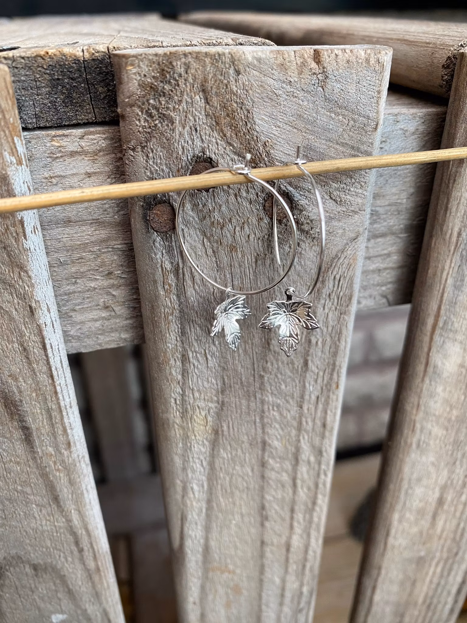 Örhängen – Löv, silver Slutsåld Örhängen med silverfärgade löv i nickelfri metall.Öppningsbara creoler av nickelfri, silverfärgad metall.Ø: 2,5 cm.