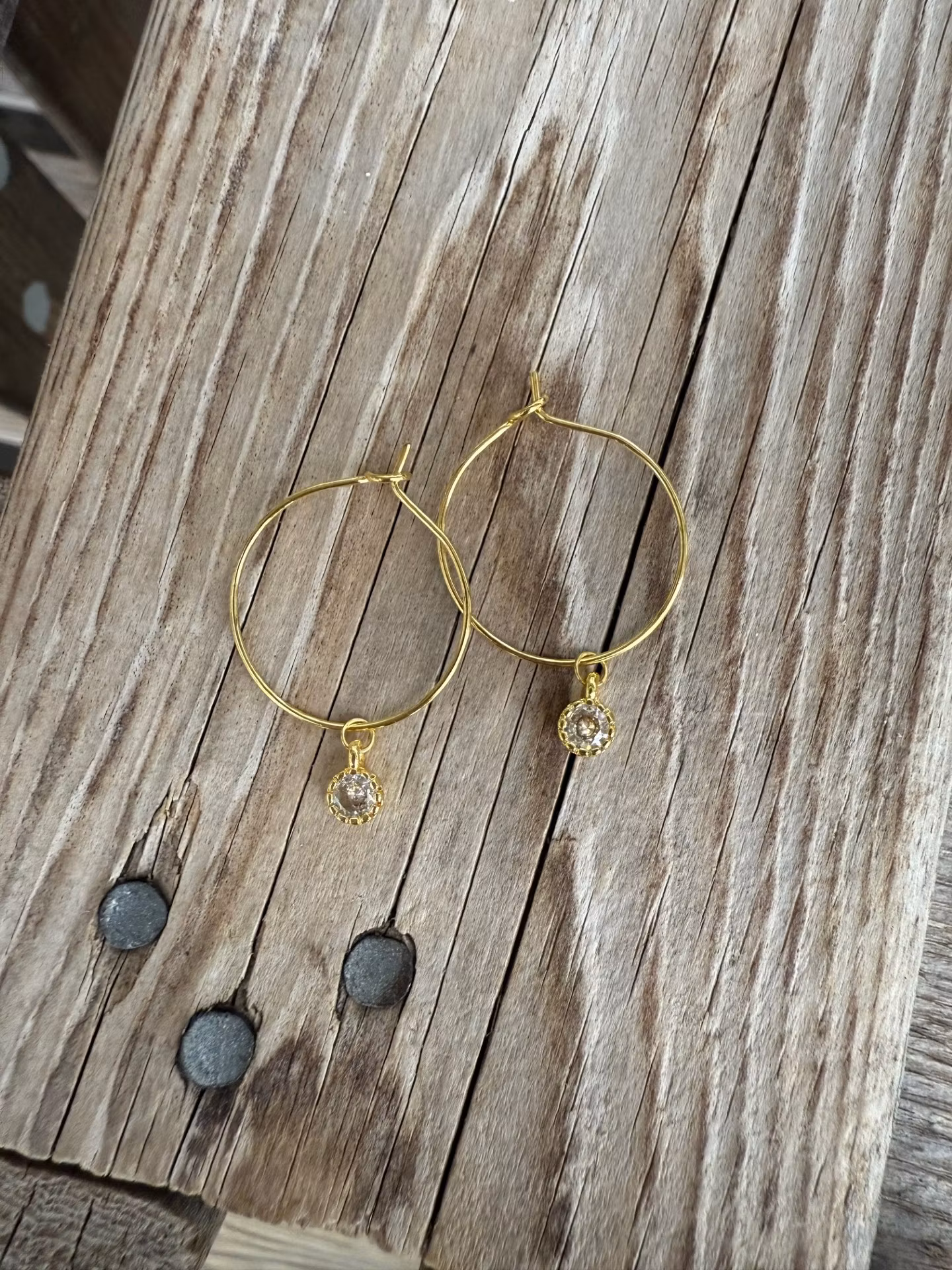 Örhängen – Cubic zirconia 0 kr 149 kr Örhängen med små berlocker av cubic zirconia.Öppningsbara creoler av nickelfri, guldfärgad metall.Ø: 2 cm.