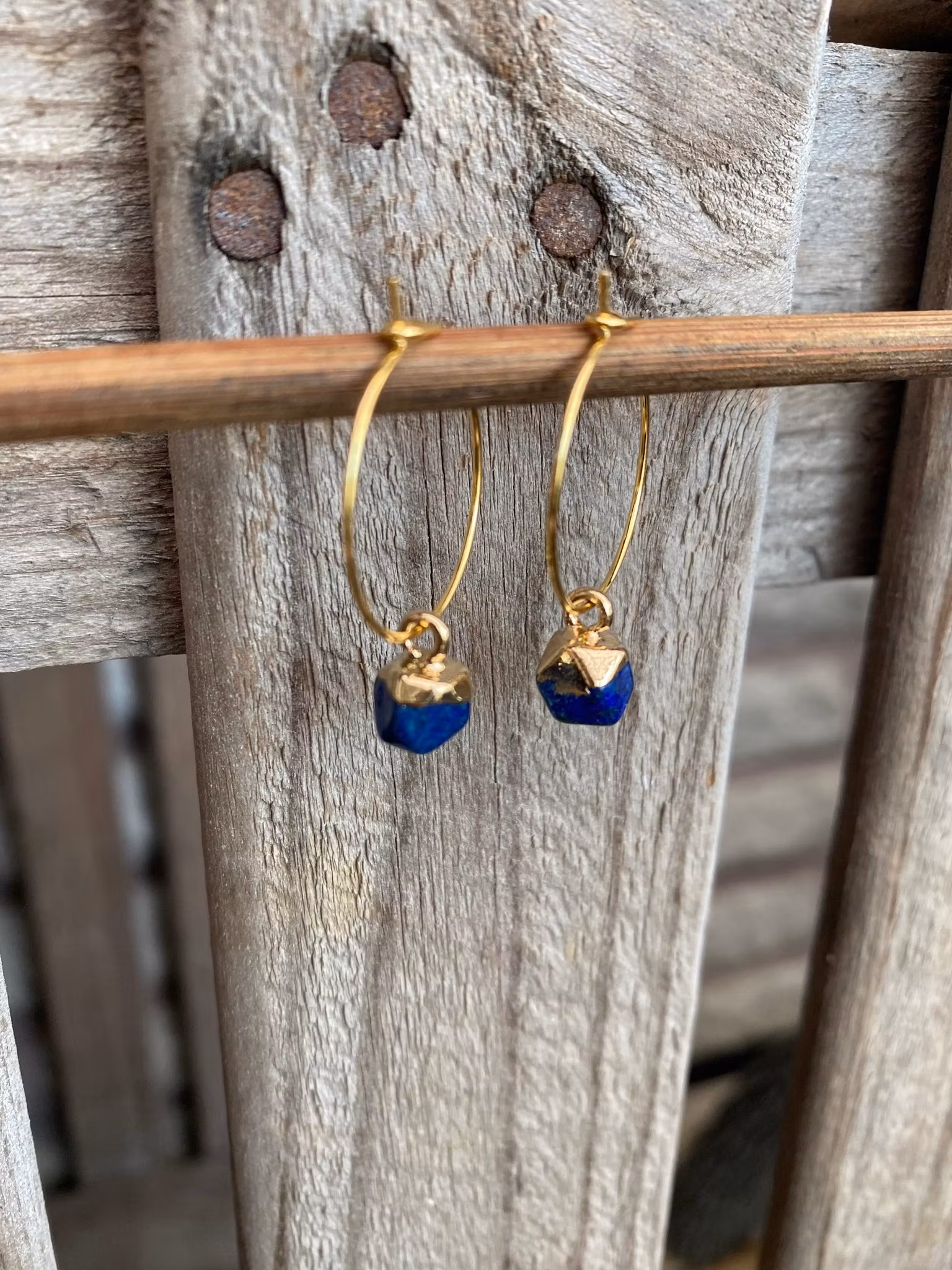 Örhängen med små, facetterade stenar av lapis infästa i nickelfri guldfärgad metall. En lite mindre variant av de populära halvädelstensörhängena som redan funnits här i webshoppen ett tag.