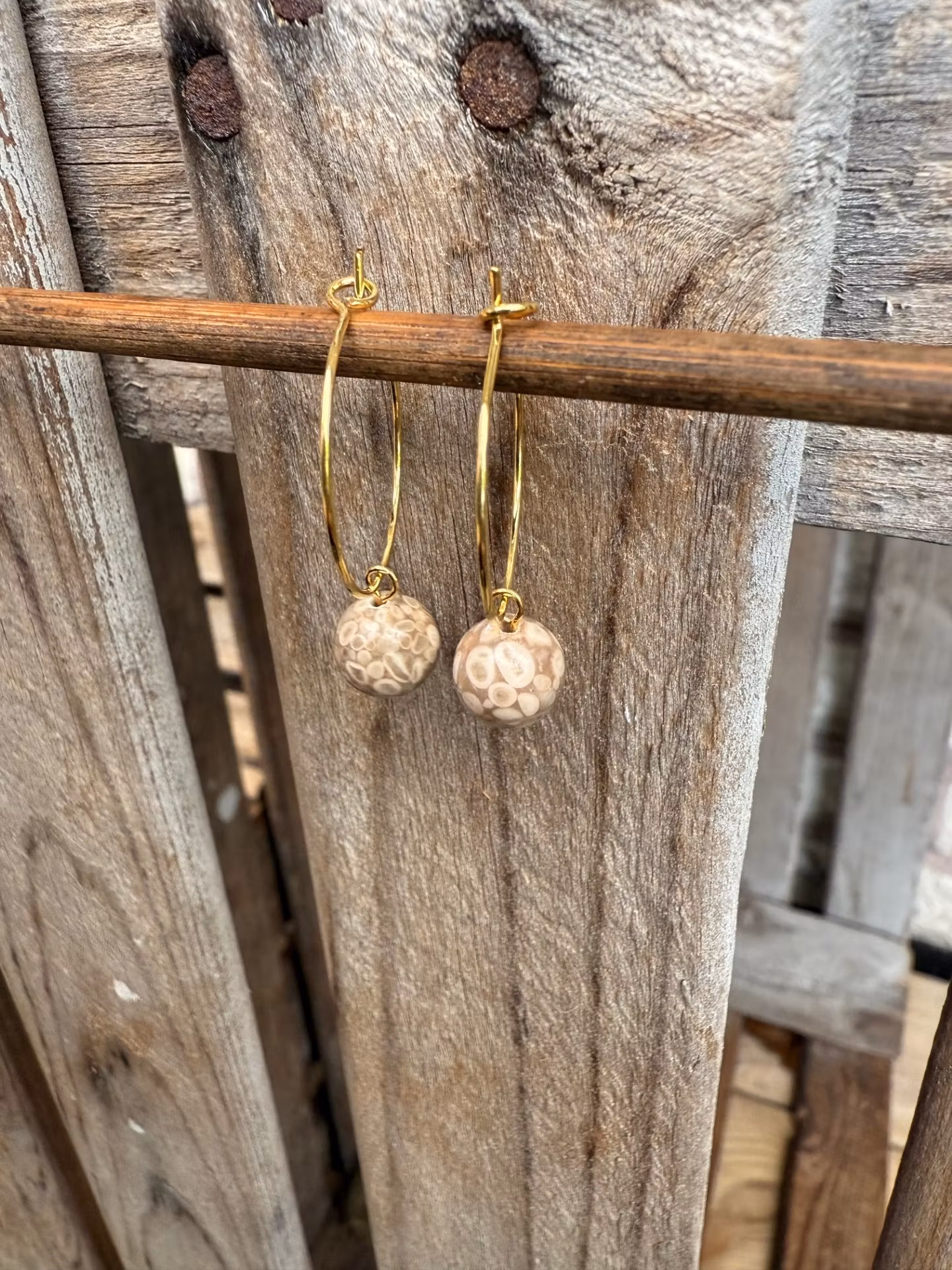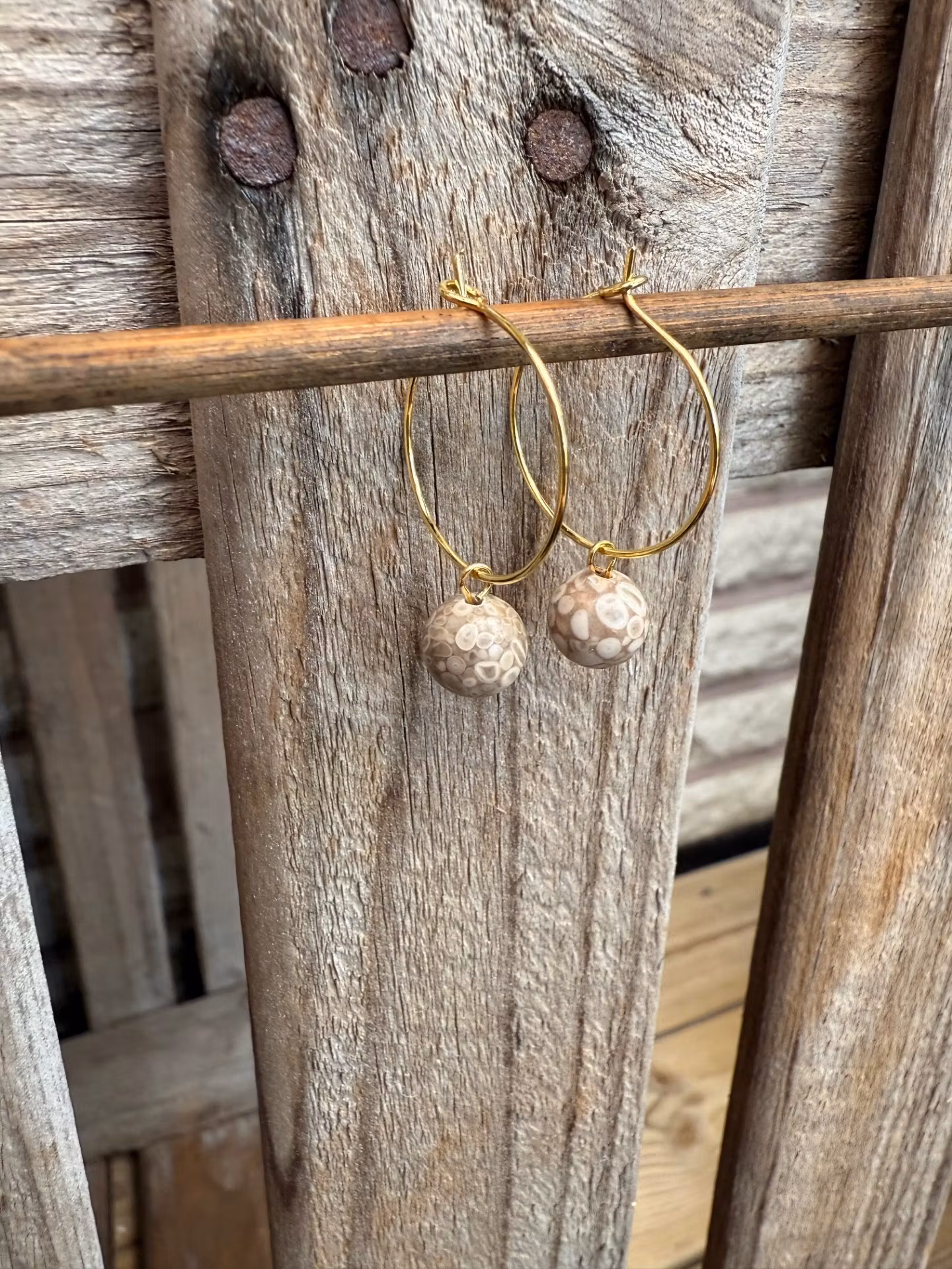 Örhängen – Maifanit, brun 0 kr 129 kr Örhängen med 8 mm runda pärlor av maifanit / maifan stone.Öppningsbara creoler av nickelfri, guldfärgad metall.Ø: 2 cm.