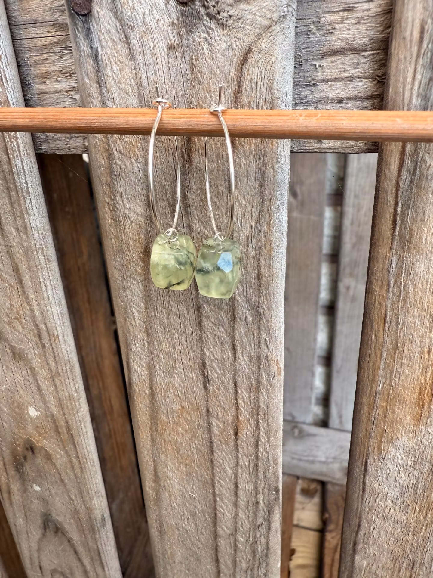 Örhängen – Prehnit 0 kr 149 kr Örhängen med 1 cm facetterade kuber av prehnit.Öppningsbara creoler av nickelfri, silverfärgad metall.Ø: 2,5 cm.Alla stenar är olika och färgskiftningar förekommer.